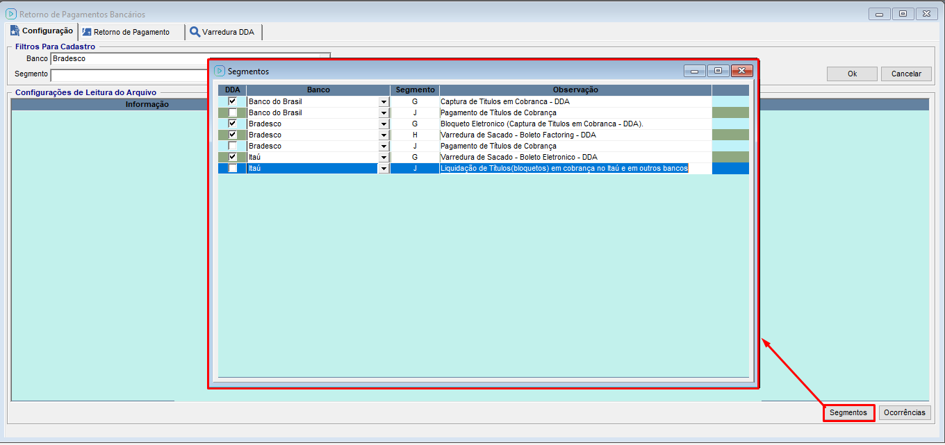 É necessário ter o segmento cadastrado em Financeiro/ Remessa Bancária/ Retorno de Pagamentos Bancários/ aba Configuração, Botão Segmentos.