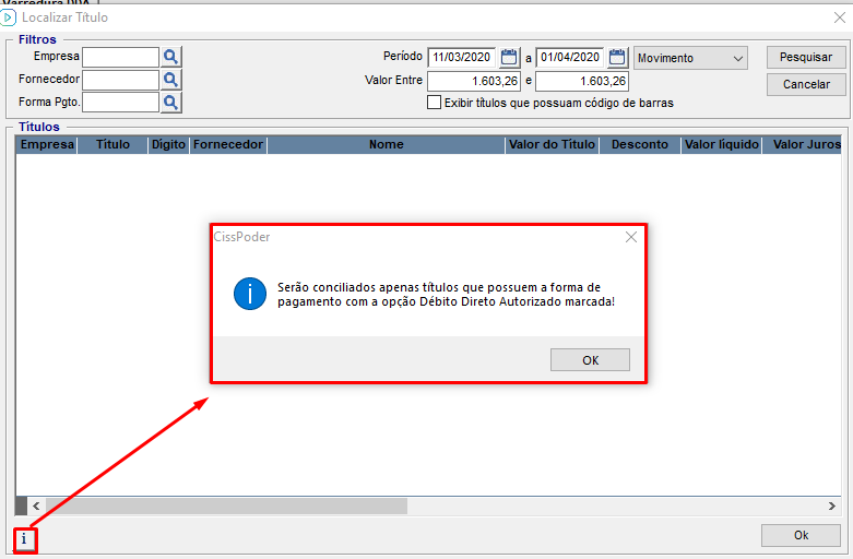 Título não localizado: Por alguma divergência o sistema não conciliou automaticamente, as possíveis causas de não localizar os títulos são: fornecedor não cadastrado no sistema, valor do título divergente, data de vencimento no contas a pagar do CISSPoder diferente do título no arquivo de varredura a opção "Débito Direto Autorizado" não estar marcada na forma de pagamento utilizada para o título lançado no contas a pagar;
