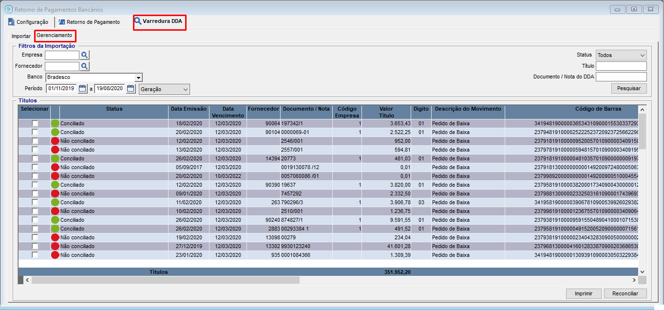 Através da aba Gerenciamento é possível filtrar os títulos com os status "Não conciliados", "Conciliados", "Ignorados" e "Todos" e buscar informando: