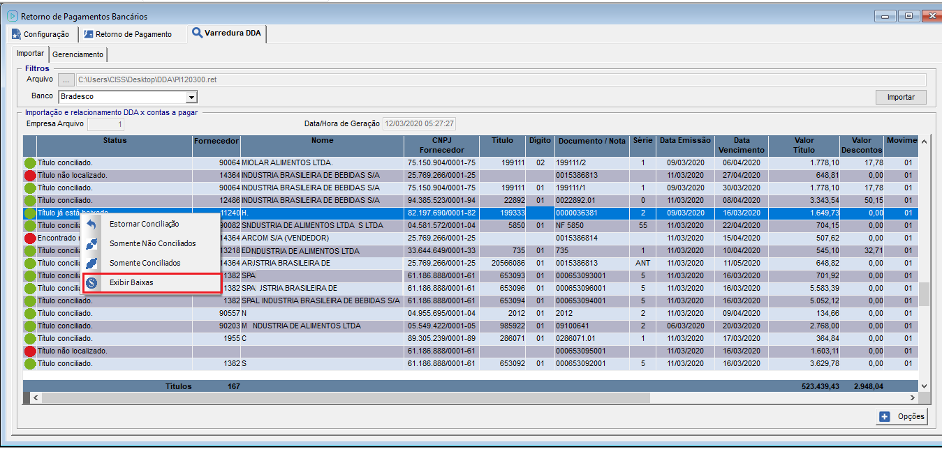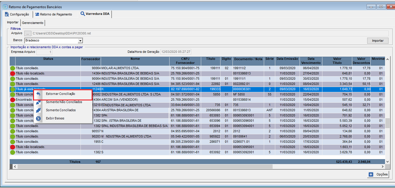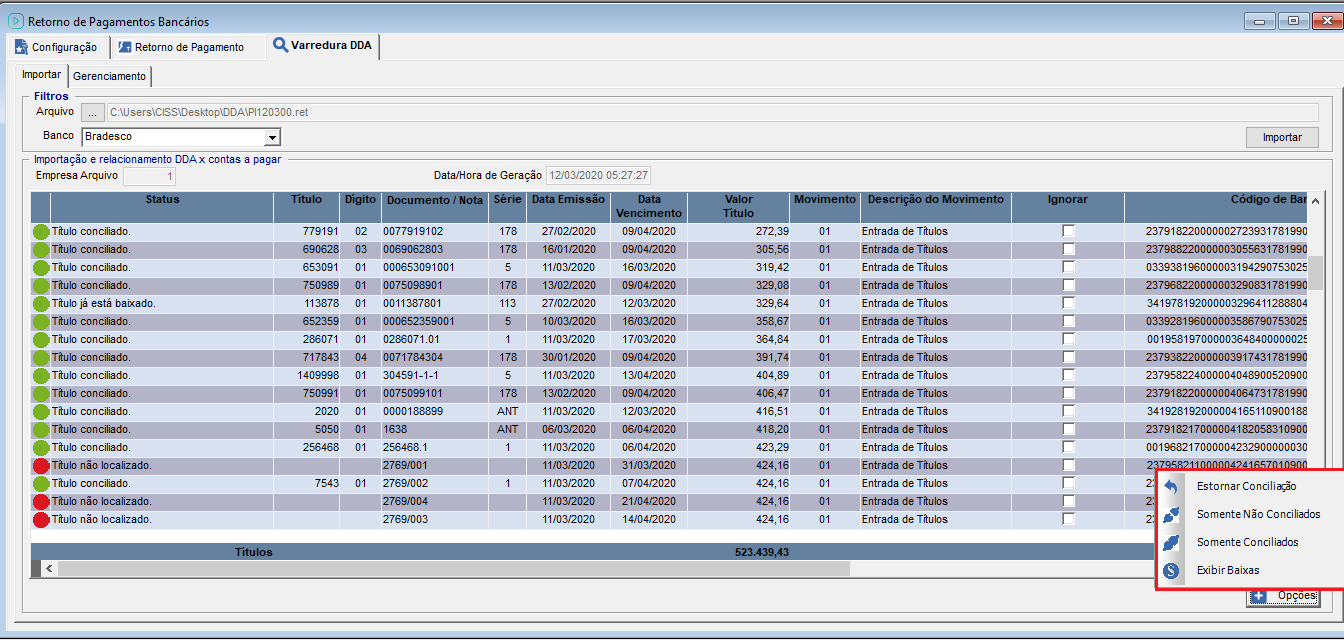 Os mesmos filtros que são apresentados no botão "Opções", são apresentados ao clicar com o botão direito do mouse em um titulo na aba "Importação", conforme os status dos títulos são apresentadas as opções.
