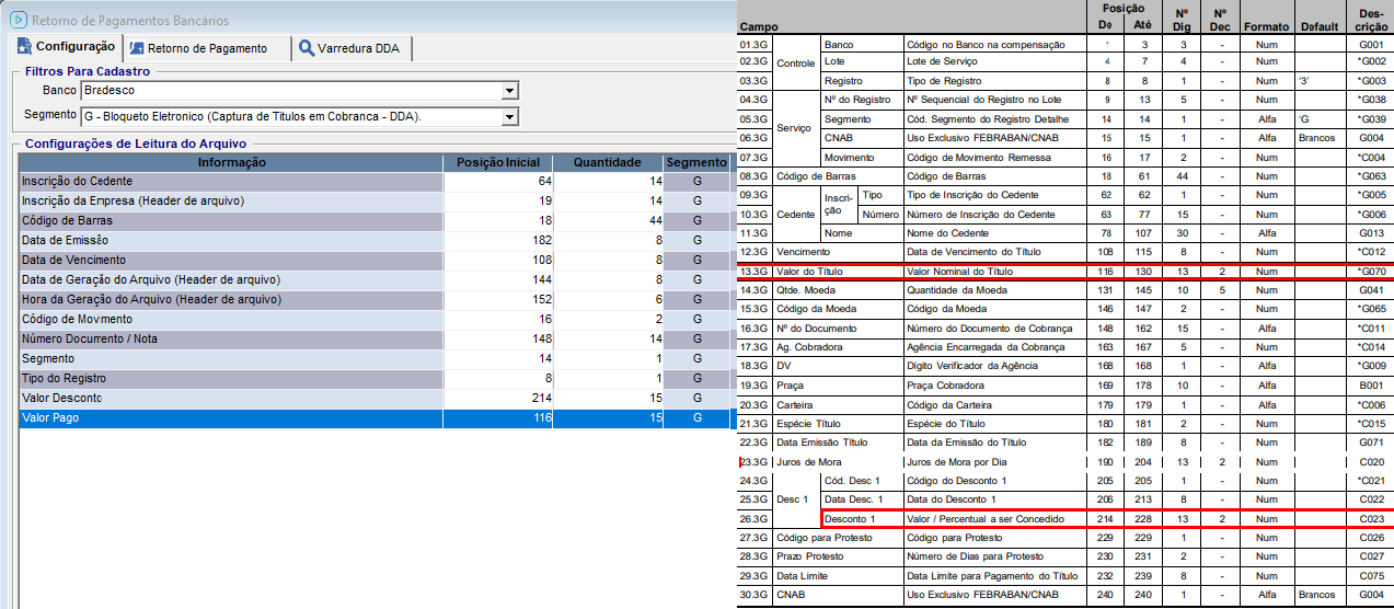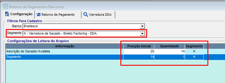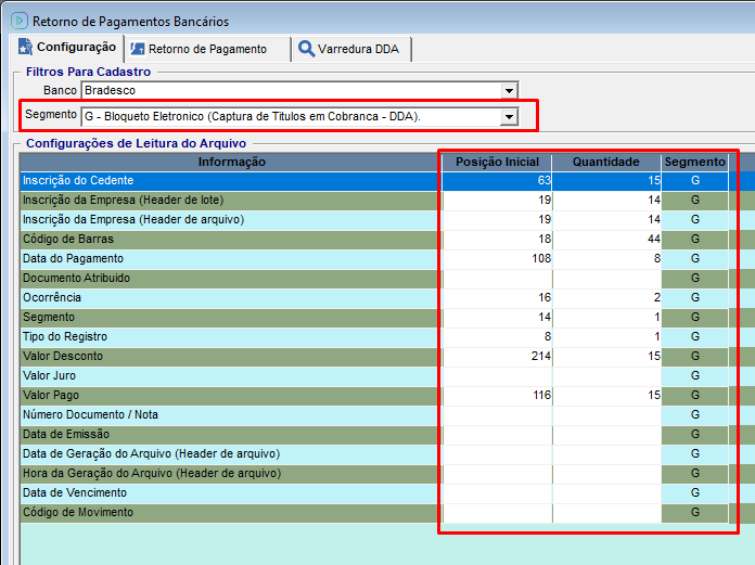 A configuração da posição inicial e da quantidade de colunas, deve ser feita através do menu Financeiro/ Remessa Bancária/ Retorno de Pagamentos Bancários/ aba Configurações, buscar utilizando os "Filtros Para Cadastro" o banco e o segmento cadastrado.