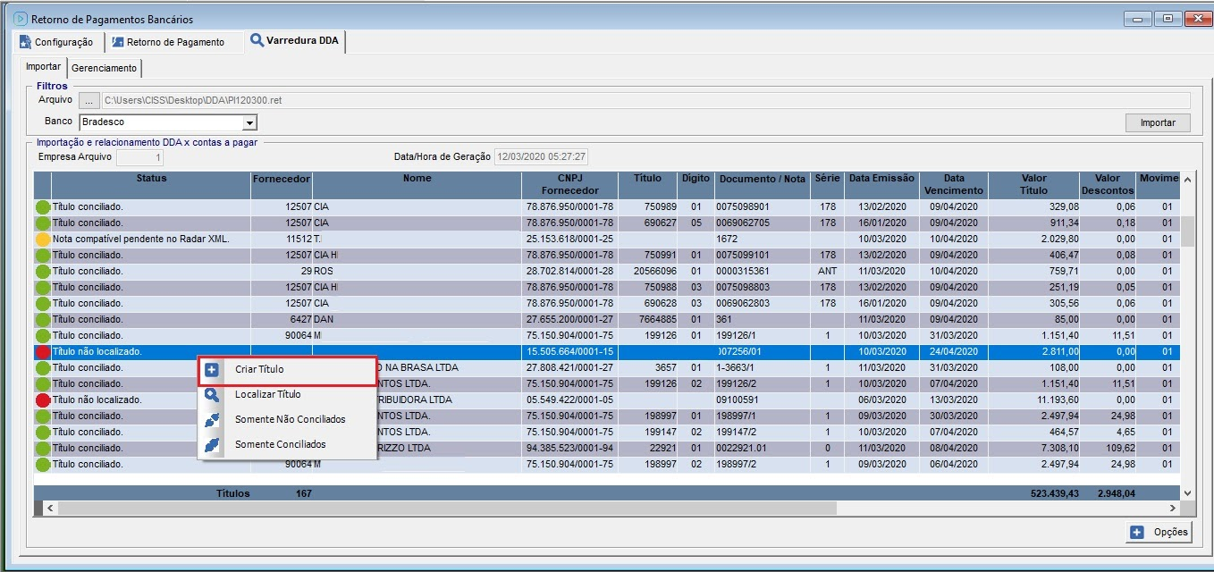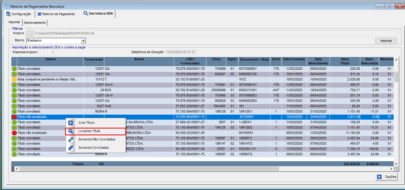 Os boletos DDA que por alguma divergência o sistema não conciliou automaticamente, será possível localizar o título de forma manual, clicando com o botão direito sobre o título não conciliado e selecionar a opção “Localizar Títulos”.