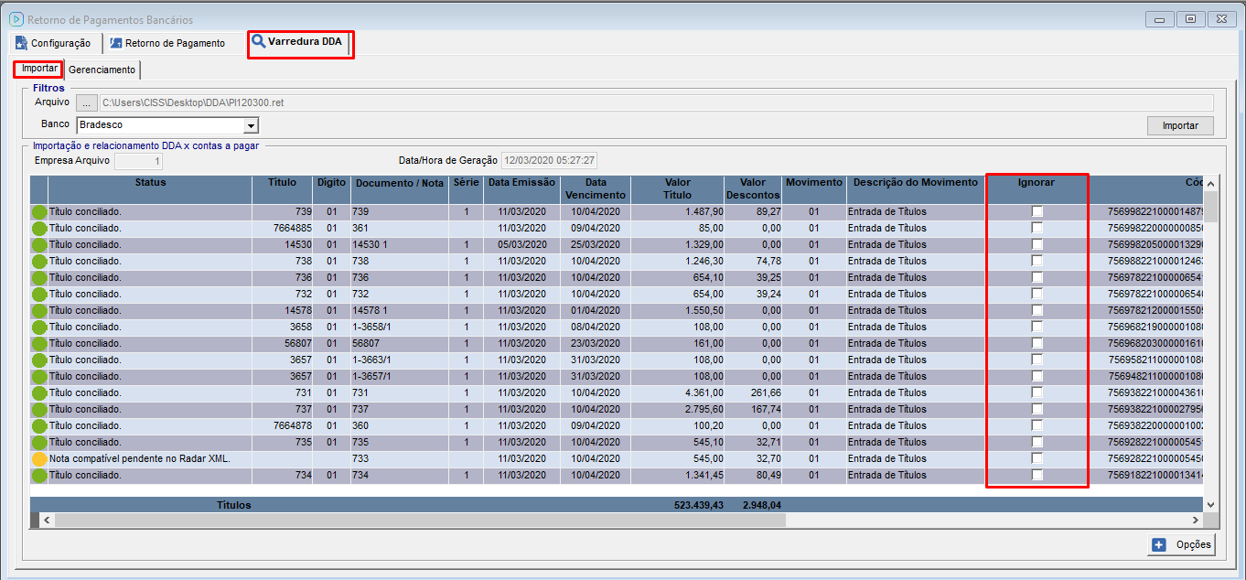 Quando houver a necessidade, será possível ignorar um ou mais registros contidos no arquivo de varredura. Somente será possível ignorar registros que não estiverem com status "Título Conciliado".