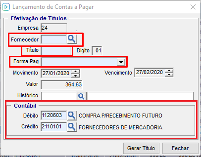 Ao clicar com o botão direito sobre um título que não pode ser relacionado automaticamente e selecionar a opção de "Criar Título", abrirá a tela ‘‘Lançamento de Contas a Pagar’’, na qual deverão as informações de: