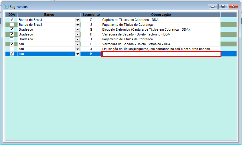Sendo necessário informar se é DDA (Débito Direto Autorizado), o Banco, Segmento e Observação e gravar através da barra de ferramentas do CISSPoder.