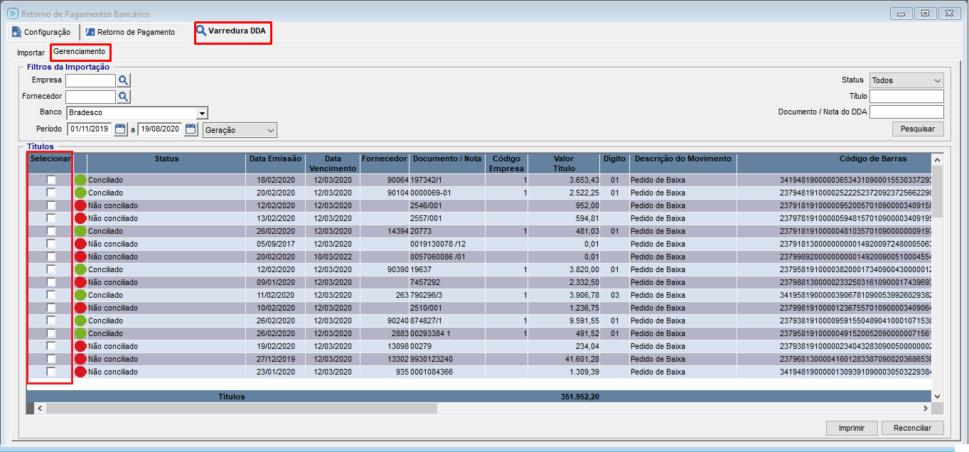 Ao marcar a opção "Selecionar" nos títulos e clicar no "Reconciliar" será feita uma nova tentativa de conciliação dos títulos.Estando com o módulo habilitado ao lançar uma nota de compra após a gravação da importação do arquivo de varredura, se efetuada a busca pela aba de gerenciamento o título será apresentado com o status conciliado.